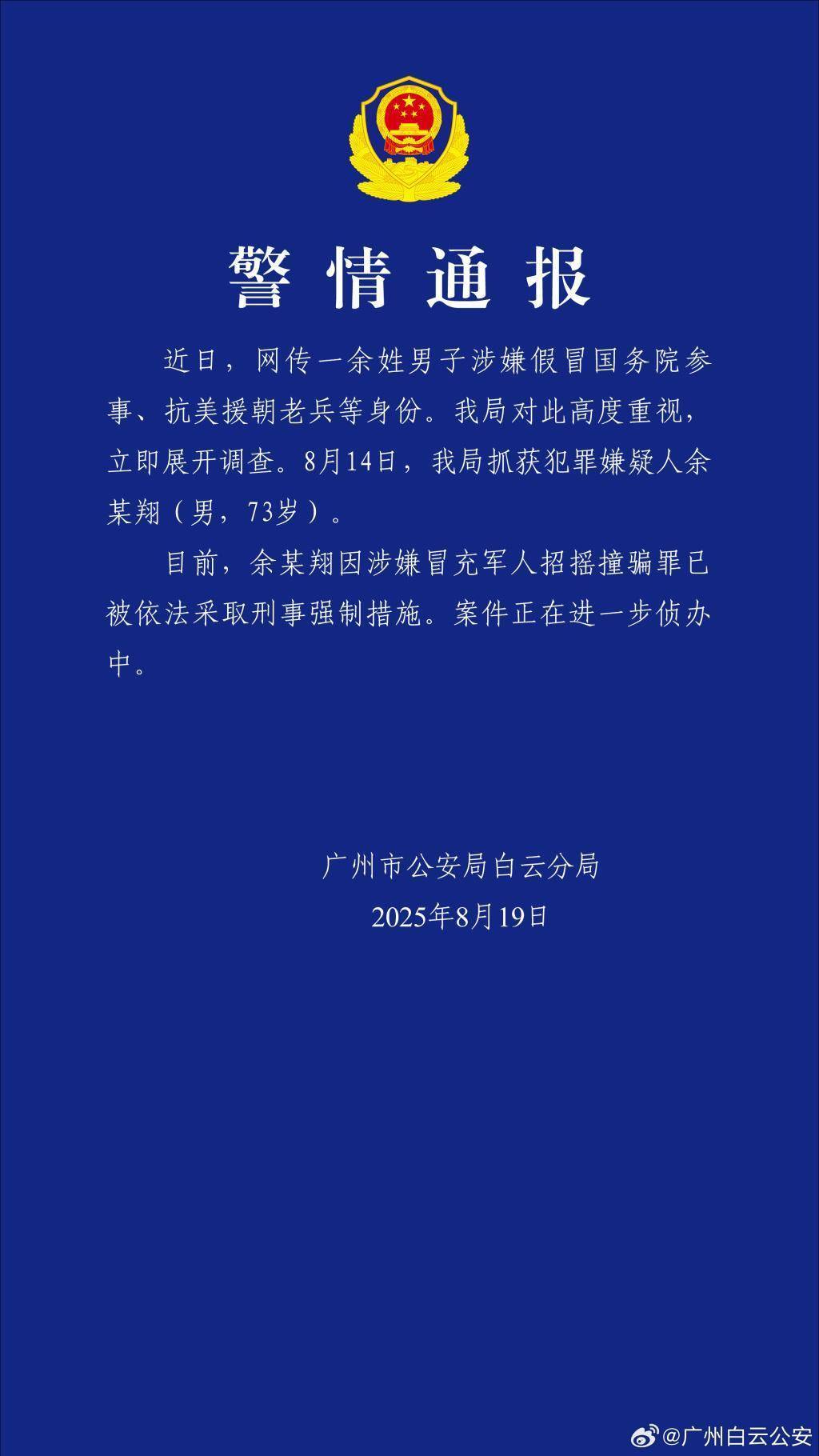 配资排行广州警方:余某翔因涉嫌冒充军人招摇撞骗罪被依法采取刑事强制措施